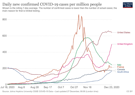 Researchers believe the UK strain to be anywhere from 56% to 70% more contagious, and the South African strain to be more infectious than that. Compare new daily COVID cases per million people recently in the UK, South Africa, United States, Canada, Italy, and France.